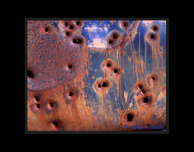 layers of paint, and oxidation (rust) and bullet holes resulted