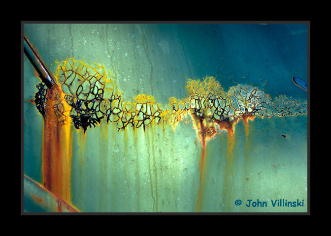 I find it truly interesting when the minute cracks in the paints surface of a car collects moistures and as the water oxidizes the metal underneath, the paint is blistered upwards, creatiing a 3D surface.