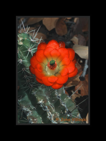 Hedge hog cacti are often inconspicuous. The flowers are not however. I found this speciman on the Oracle Ridge trail in the Santa Catalina Mountains north of Tucson, AZ, (2001).