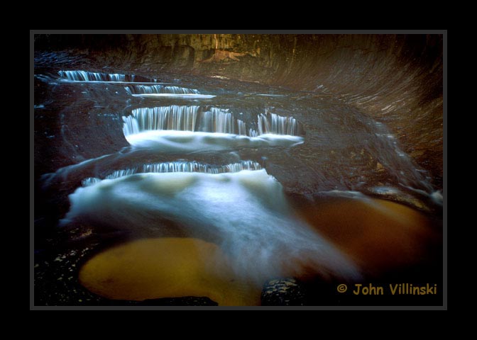 sandstone canyon walls gives the walls a golden glow. A long shutter